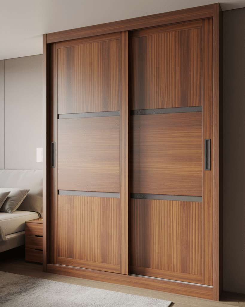 Classic wooden sliding doors featuring rich grain patterns and warm tones that add natural elegance to any bedroom.