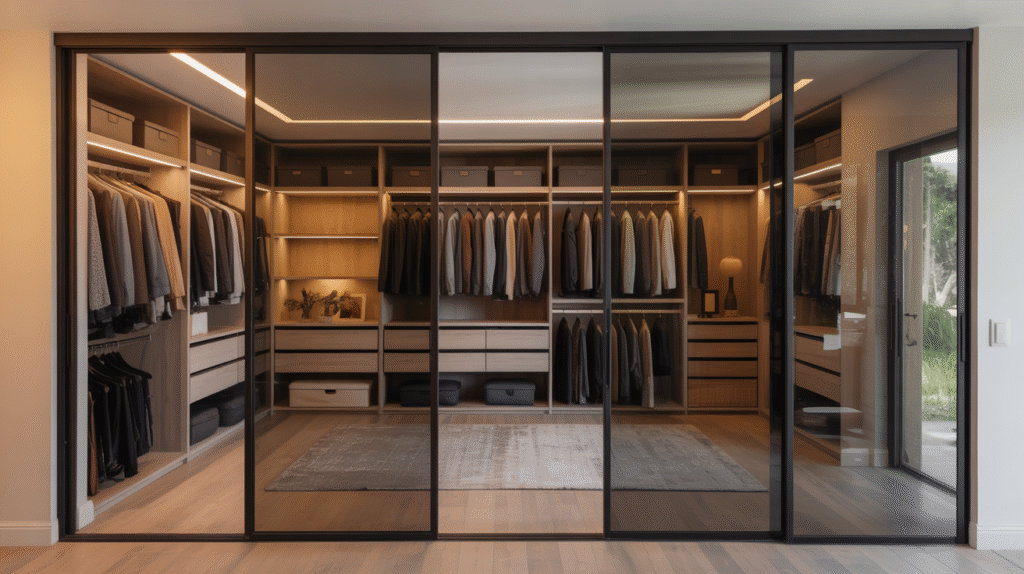 Complete walk-in wardrobe systems with custom sliding doors, shelving, and organizational features for luxury storage.